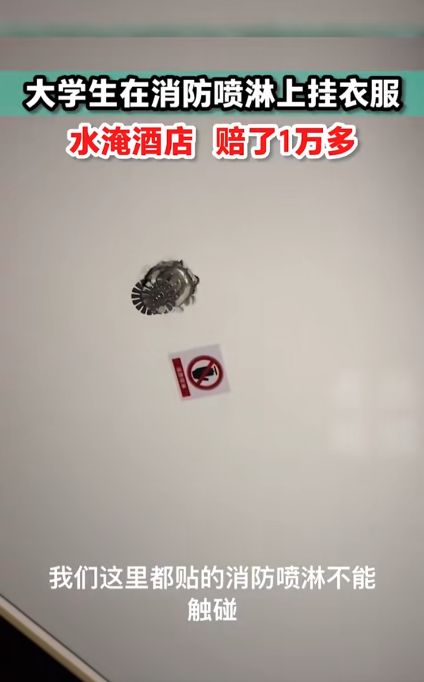 2023年5月,辽宁大连,一名大学生住酒店时在消防喷淋头上挂衣服,导致水淹客房,客房内的电器、家具全被泡水。大学生最终赔偿损失费1万多元。